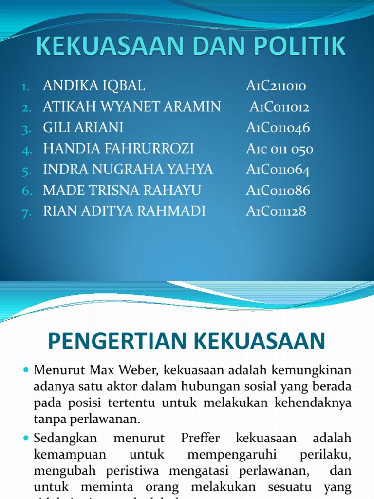 Kekuasaan adalah kemampuan seseorang untuk memperoleh seuatu sesuai dengan cara yang dikehendaki. Kekuasaan dilaksanakan dengan isyarat atau perintah yang jelas. Pemerintah dalamartiluas didefinisikan sebagai suatubentukorganisasi yang bekerja dengan. Menurut harold d.laswel kekuasaan adalah suatu hubungan dimana sesorang atau sekelompok orang dapat menentukan tindakan seseorang atau kelompok lain kearah pihak pertama, perumusan yang paling umum dikenal yaitu kekuasaan merupakan kemampuan seseorang pelaku untuk mempengaruhi pelaku seorang pelaku lain dalam hal ini kekuasaan selalu berlangsung minimal antara dua pihak jadi di. Dari bentuk penyalahgunaan kekuasaan dalam bidang politik, ekonomi dan masyarakat dalam berbagai cara dan bertindak, sebagai perantara utama dalam hubungan sosial antar masyarakat terhadap kriminalisasi dalam hukum pidana, hukum pidana yang berupayakan cara negara dapat menuntut pelaku.